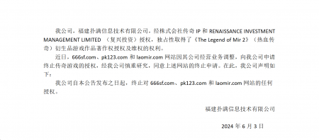202405-188868体育信息技术有限公司(以下简称“我司”)经株式会社传奇IP 、RENAISSANCE INVESTMENT MANAGEMENT LIMITED (复兴投资...